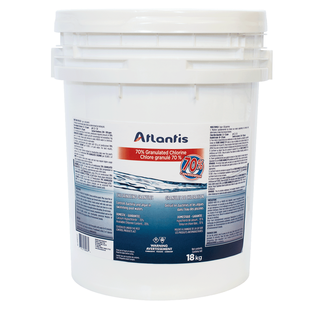 Atlantis Chlorine 70%, a high-quality granular chlorine with reduced calcium content. It dissolves quickly and provides immediate action, thus preventing the formation of white clouds and leaving your water perfectly clear. This product is specially designed to avoid problems associated with lower quality chlorines.
