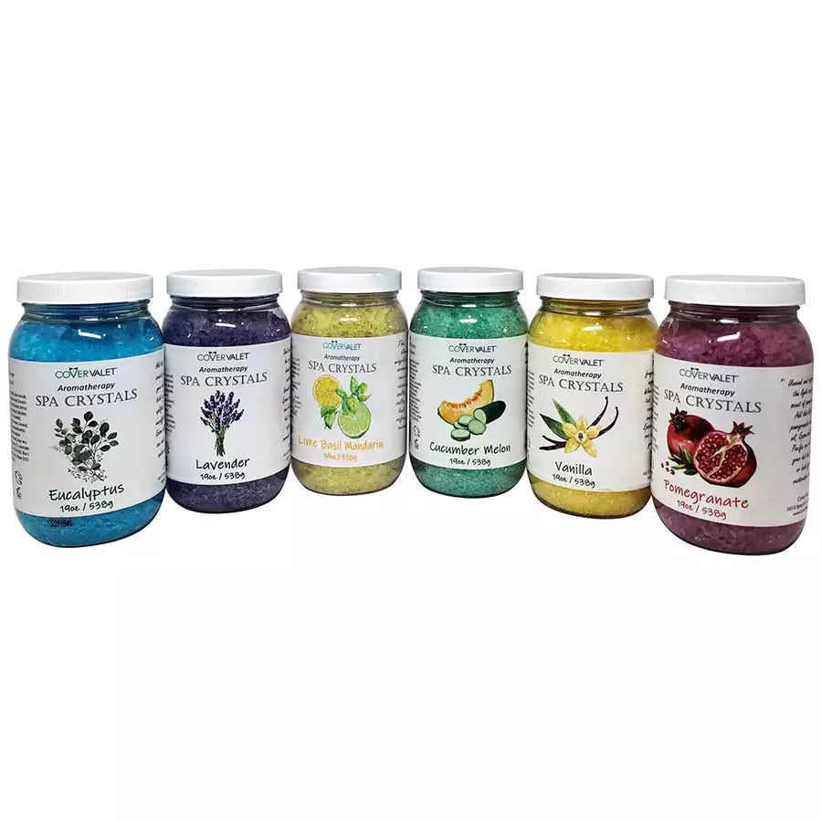 The new Spa Crystals fragrance line combines a unique blend of plant extracts and vital minerals to create the only fragrance crystals created particularly for the spa/hot tub sector. Each beautiful jar of Spa Crystals has 19oz of aroma crystals, which come in a variety of scents and are sure to improve the quality of any soak. Allow the benefits of Spa Crystals to pervade your senses.